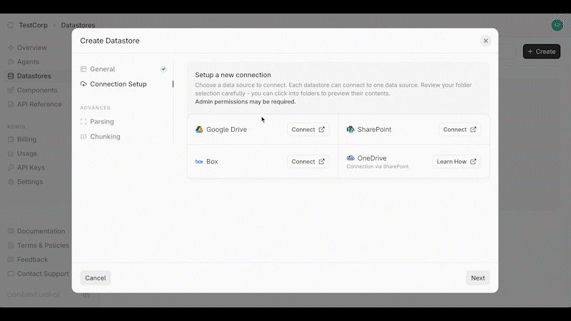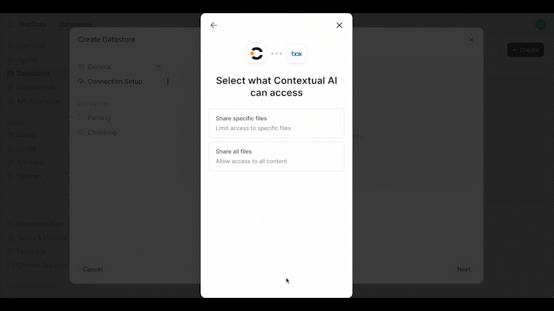 Contextual AI offers two ways to sync your data. You can choose to sync all your files or only specific folders in Box.Sync Options