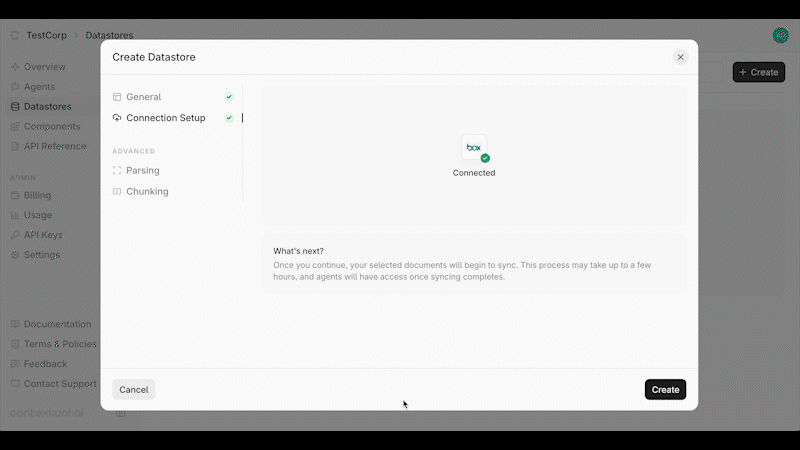 You’re now ready to start syncing your data. Click Create to initialize your connection and create your datastore. You’ll be redirected to your Datastore page, where the Syncing Metadata status will appear. During this stage, Contextual AI syncs your file metadata, users, and groups. This process is typically quick but may take a few hours if you have a large number of files, users, or groups. Once metadata syncing is complete, ingestion will begin automatically and the status will update to Processing.Note: You can begin using your datastore while syncing continues, but you’ll only have access to the documents that have already been ingested.