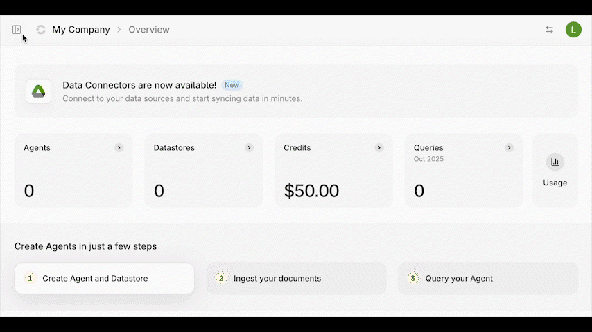 Note: You can query your agent only after at least one document in the datastore has been fully processed. See Step 3 for instructions on verifying your document’s upload status.